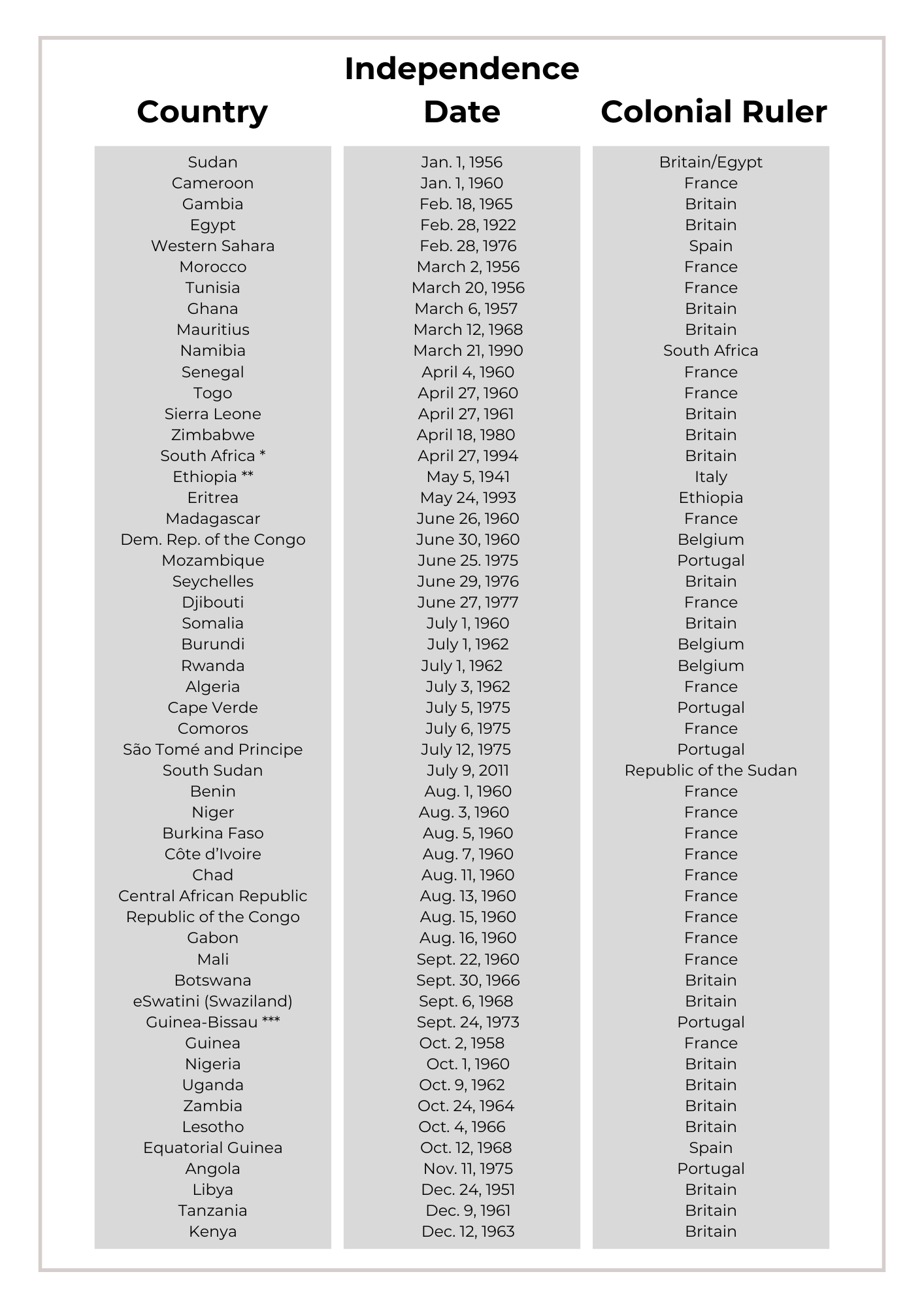 *** Guinea-Bissau made a Unilateral Declaration of Independence on September 24, 1973, which is celebrated as Independence Day. However, Portugal recognizes independence as September 10, 1974, as a result of the Algiers Accord.