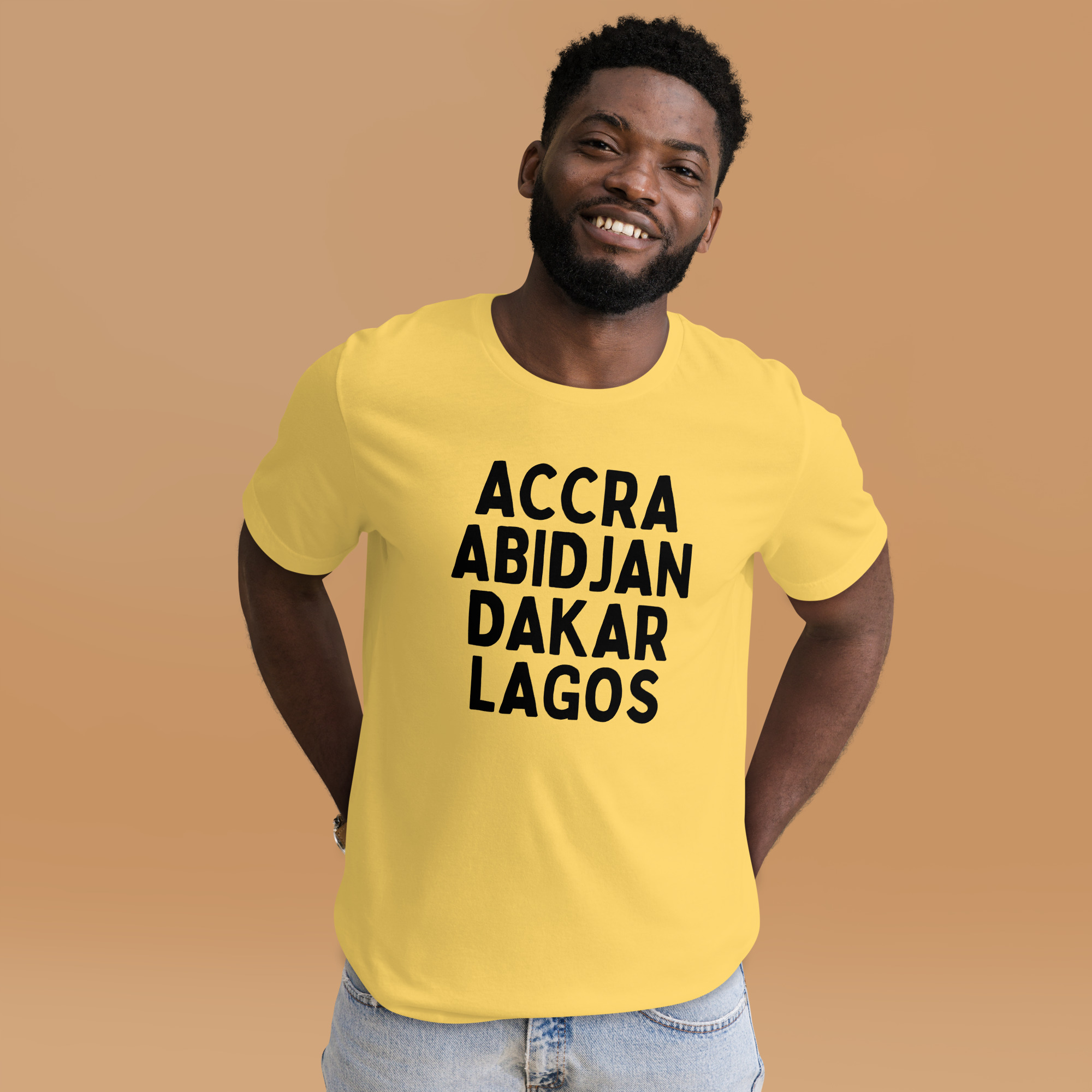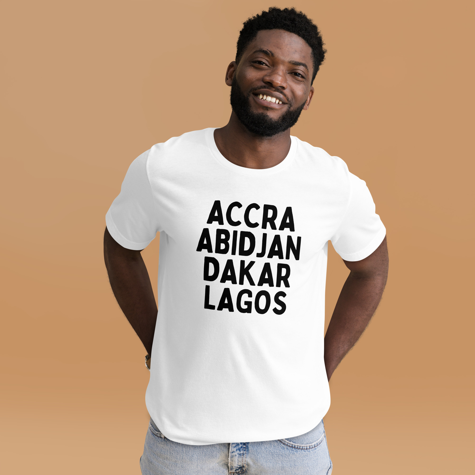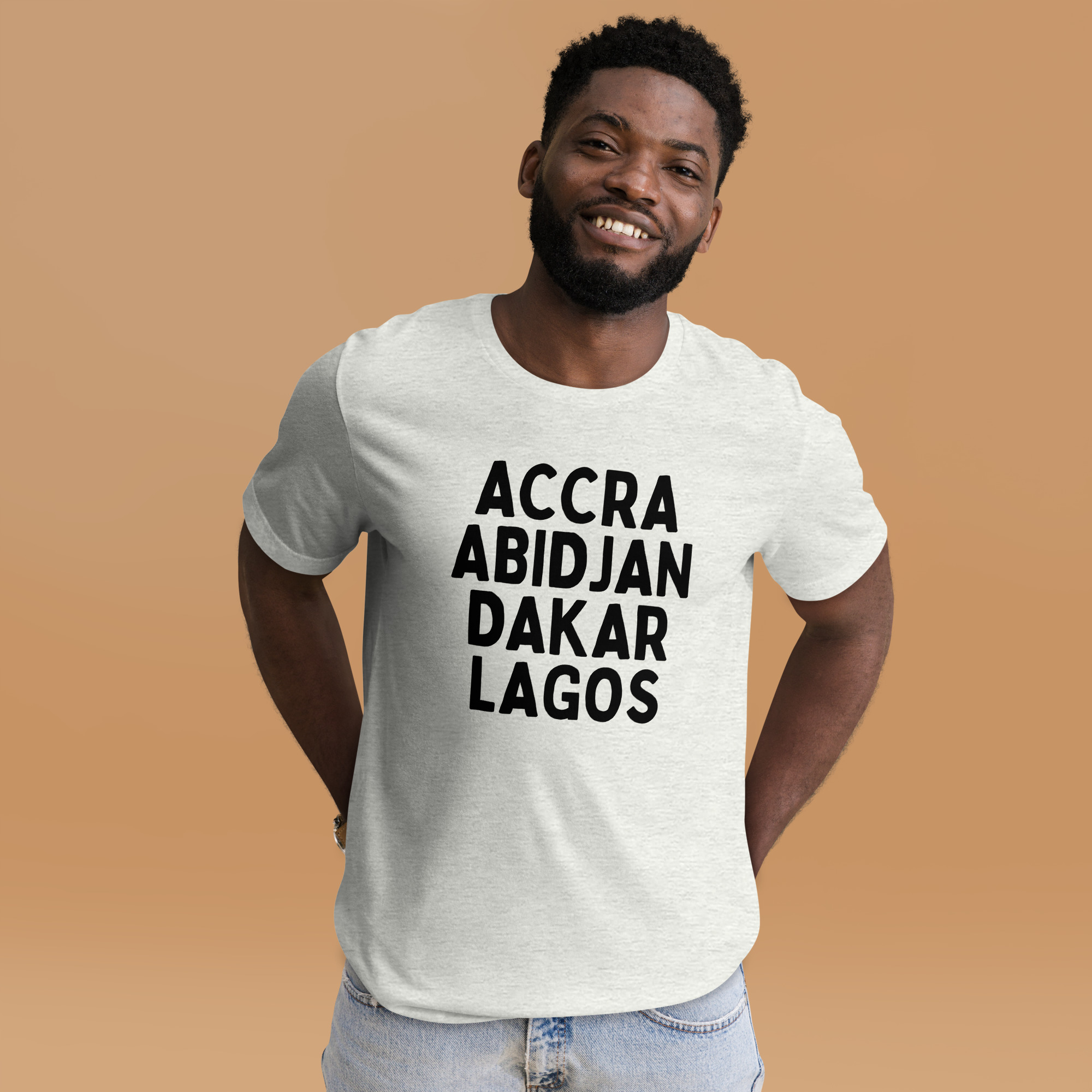 From our Africa Regions series, this t-shirt reps some of our favorite cities in Africa: Accra, Abidjan, Dakar, and Lagos